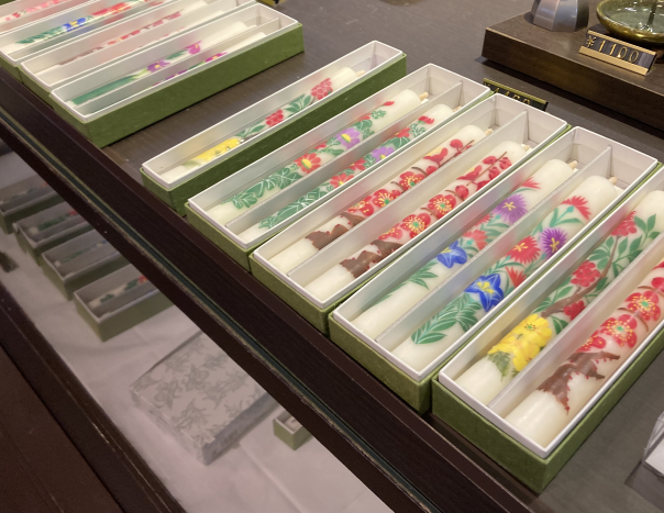 小澤ろうそく店の絵ろうそくの特徴は、白地の蝋燭に花の絵が描かれており、芯先が整っていて全体的に形が整っているのが特徴です。